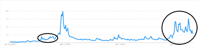 Os dados do Google Trends indicam o quanto as pessoas estão procurando por um termo específico na maior ferramenta de busca do planeta. Segundo a análise do portal Bitcoinist, os índices atuais de pesquisa sobre “Bitcoin” mostram que a curva hoje é semelhante à do mercado altista de 2017.
