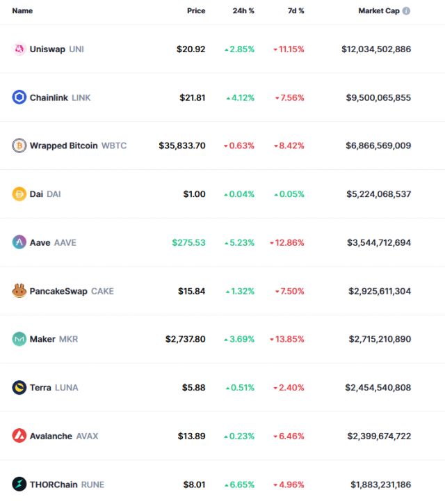 Alguns site especializados como CoinGeko e CoinMarketCap possuem uma área apenas para os tokens DeFi. Em junho de 2021, quando esta matéria está sendo escrita, os principais são.